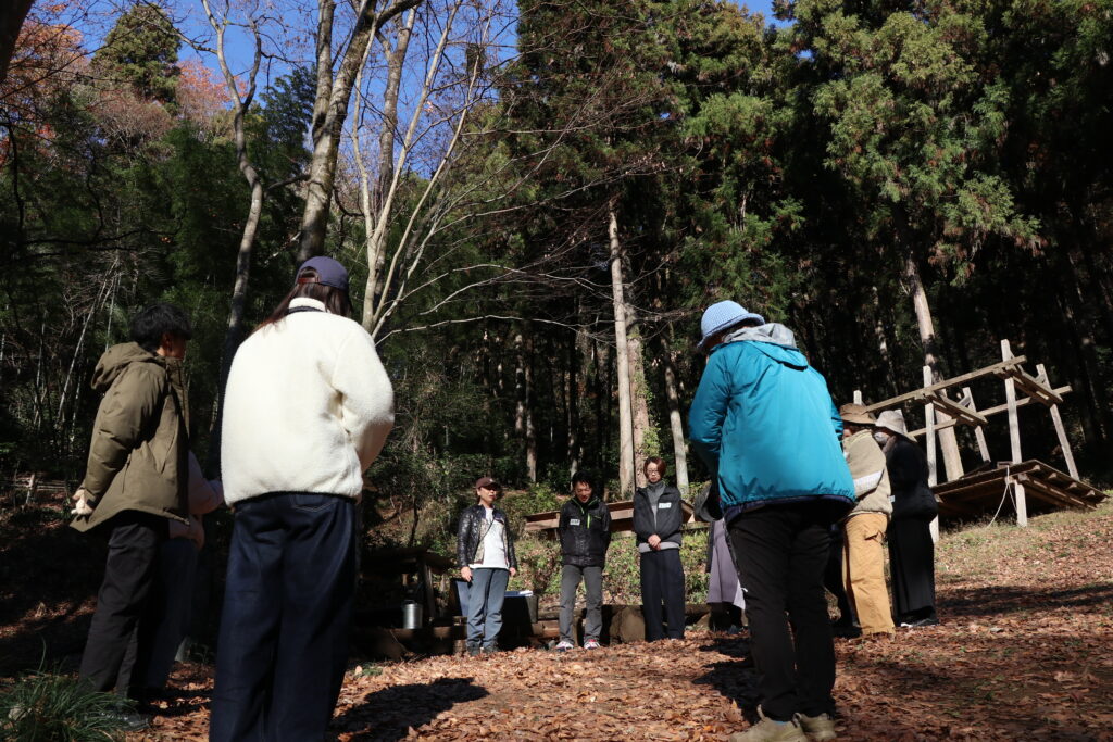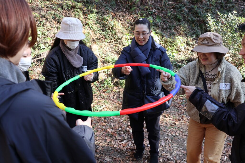 圏央道相模原ICより5分で、森の麓の建物に到着しました。身支度を整えて、民家が並ぶすぐ先の「つちざわの森」に入ると、紅葉の葉が舞い散る里山の風景が広がっていました。知らない場所での研修で緊張している心と身体をほぐすストレッチをした後に、ファイブカウント、ミスティカルフープといったゲームを行いました。体を動かすゲームを上司と部下といった立場を超えて一緒に楽しむことで、緊張も一気にほぐれて、和やかな雰囲気が生まれました。