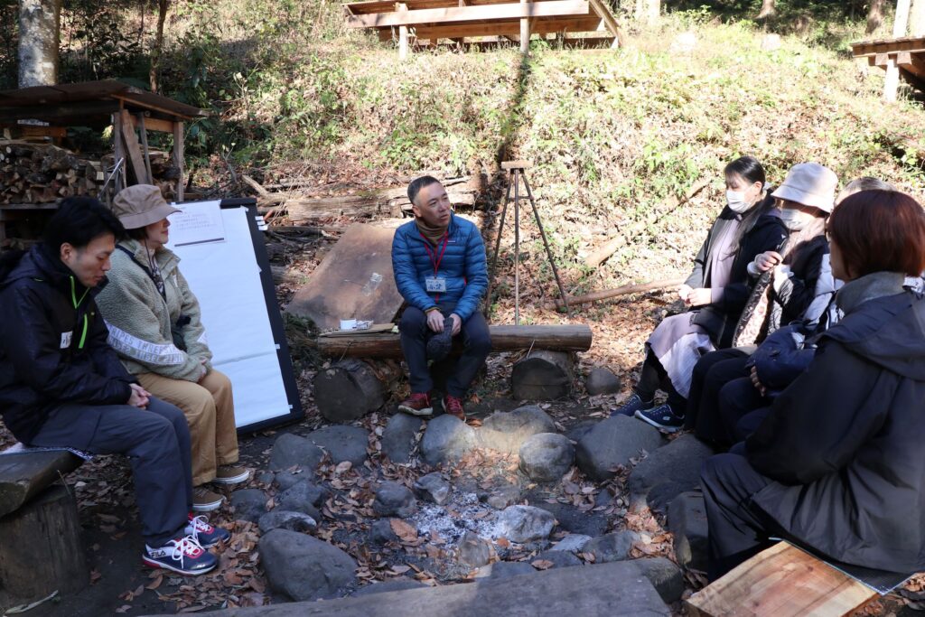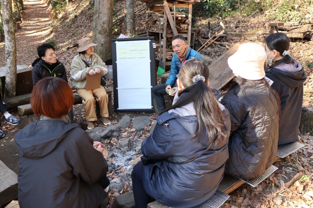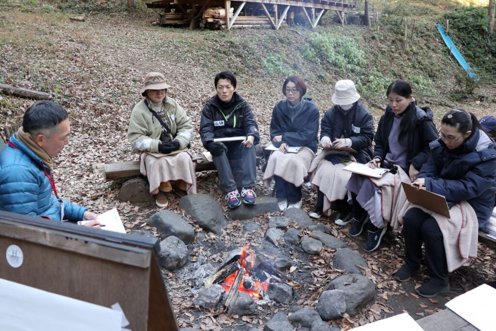 講師のファシリテートのもと、焚き火を囲んで円形に座り、ワークシートに沿って、今日の経験、印象的な出来事や記憶に残る言動や自分の感情、自分が大切にしていること(価値観)を書き出し、話せる人から共有していきます。 焚き火の温かさを感じ炎を見つめながら、お互いの感じ方考え方に耳を傾けます。「人それぞれで、それが大切」「仕事から離れられた」「心にスペースがないと、受け入れられない、こういう機会を自分でつくっていきたい」「原点に戻った」などの感想がありました。