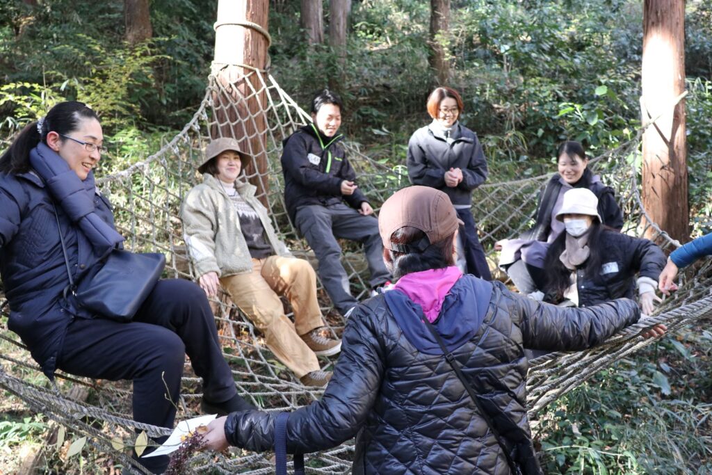 森林浴ファシリテーターの案内のもと、五感をフルに使い森を感じる森林浴(森歩き)をすることで、「思考」を休め「感覚」に意識をシフトします。森の成り立ちや手入れ、歴史や地域の人々の関わりを知ることで、過去・現在・未来といった時間の流れや、これからの自分たちの未来に想いを馳せます。感じることに正解・不正解はないことを伝えると、徐々に安心して自分の発見や好きなことを伝えられ、お互いの話しを構えずに聞けるようになっていきます。 木漏れ日をキャッチするワーク、鳥の声を聴いたり、木に触れたり、土や葉の匂いを嗅いだり、最後は全員でハンモックに体を預けます。ゆっくりと森を歩くことで体も温まり、童心に帰って楽しむ表情が印象的でした。森林浴の後の感想では「ふだん気にも留めないことに気づけた」「匂いをいっぱい嗅げたのが楽しい」「いろんな音、鳥、足の裏の葉っぱの感触など、たくさんの発見があった」