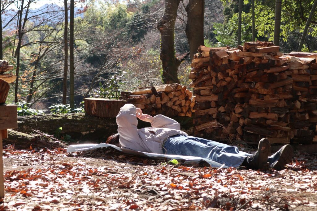 焚き火の火が落ち着いたら、今度は一人になって森の中で好きなように過ごしながら、今日の経験を振り返り、自身の価値観を見つめる時間を持ちます。一か所に佇んで木々の葉の音を聴く人、落ち葉の道の感触を楽しみながら散策する人など、思い思いに過ごしつつ、今日を振り返ります。