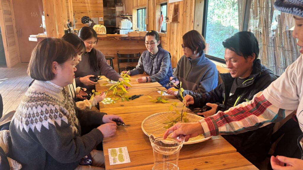 森林散策で拾ってきたクロモジの葉を枝から外す