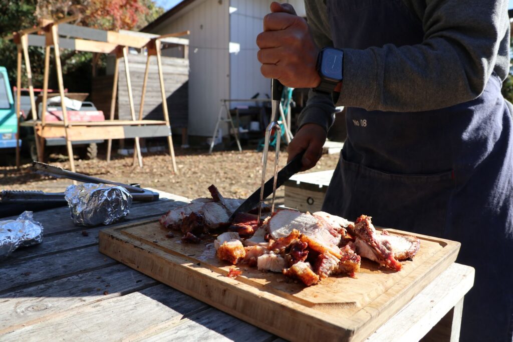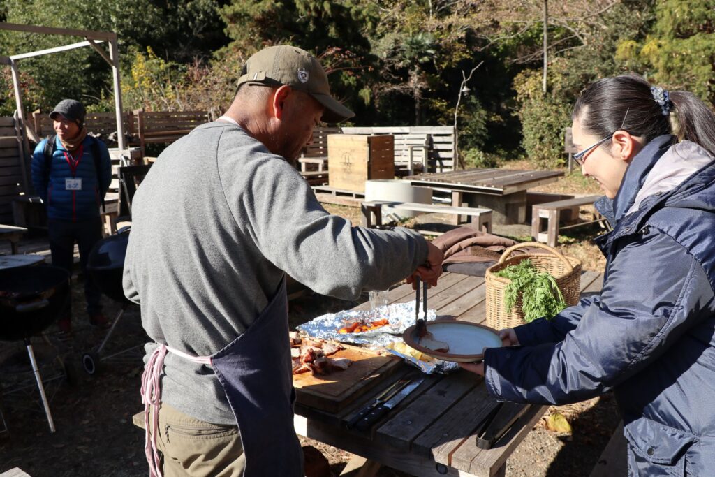 大型のBBQグリルで放牧豚の塊を蒸し焼きに。食べやすい大きさにスライスしたお肉はジューシーで、地産の人参などの丸焼き野菜はとても甘く、具沢山な豚汁とともに、木の香りのするカフェ店内で召し上がっていただきました。森林浴で五感が研ぎ澄まされた後の温かい食事に笑顔がこぼれます。