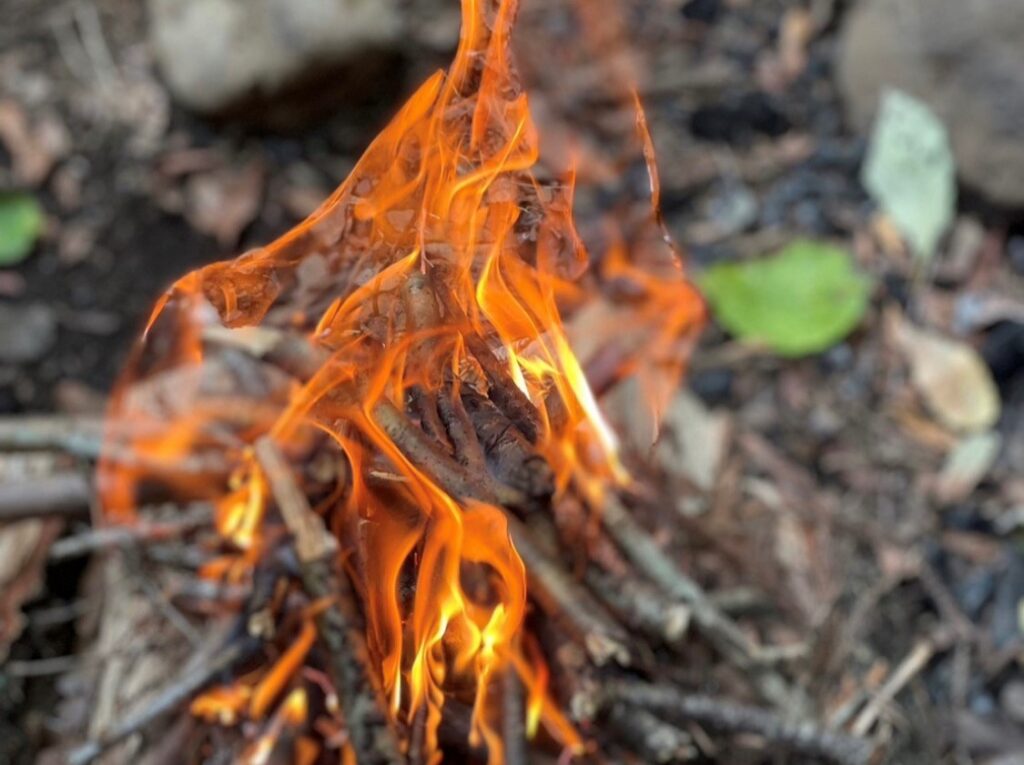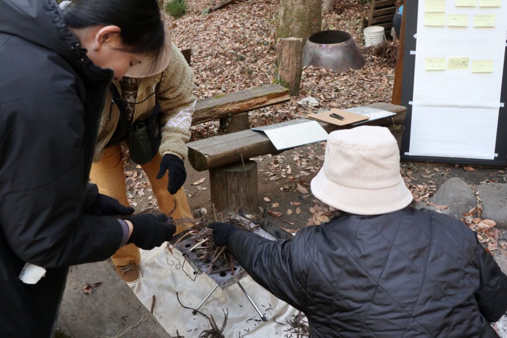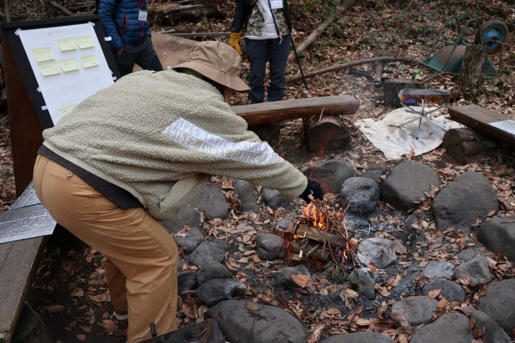 再び森へ行き、チームに分かれて火熾し体験と焚き火をしました。チームで協力して燃えそうな枝や葉を集め、ファイヤースターター(火付け石)で火を熾します。冷たい空気の中で、競い合って体を動かし交代したり応援したりしながら、火が点い時には歓声があがりました。
