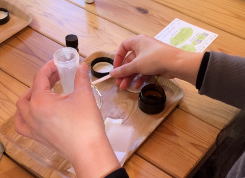 香りのワークショップ講師のもと、森の香り(木の精油)を用いたバームを作ります。単に香りを使うということではなく、精油の採れた森やその手入れの話しを聞き、森に想いをめぐらせながら、自分の好きな香りを選びます。ギュッと近い距離に座って、蜜蝋を溶かすために手を動かす同じ作業に没頭しながら、思いついたことをあれこれ口にする、リラックスする時間にもなりました。「良い香りに包まれて癒された」「香りを持ち帰って使うことができるのが嬉しい」などの感想がありました。